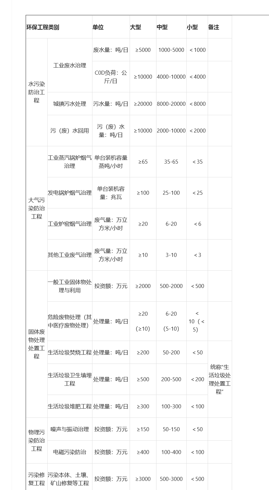 環(huán)保工程主要指水污染防治工程、大氣污染防治工程、固體廢物處理處置工程、物理污染物防治工程和污染修復(fù)工程等,其中:水污染防治工程包括工業(yè)廢水防治工程、城鎮(zhèn)污水污染防治工程(不含市政管網(wǎng)、泵站以及廠內(nèi)辦公樓等公共建筑物)、污廢水回用工程及醫(yī)院、畜禽養(yǎng)殖業(yè)、垃圾滲濾液等特種行業(yè)廢水污染防治工程;大氣污染防治工程包括煙塵、粉塵、氣態(tài)及氣溶膠、室內(nèi)空氣等污染防治工程;固體廢物處理處置工程包括生活垃圾(不含辦公樓等公共建筑物)、一般工業(yè)固體廢物、危險固體廢物及其他固體廢物處理處置工程;物理污染防治工程包括交通噪聲、建筑施工噪聲、工業(yè)噪聲、室內(nèi)噪聲、電磁及振動等污染防治工程;污染修復(fù)工程包括污染本體、污染土壤、礦山及其他生態(tài)修復(fù)或回復(fù)工程。